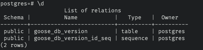 initのようなコマンドはなく、gooseでの初回接続時に管理テーブルが初期化される